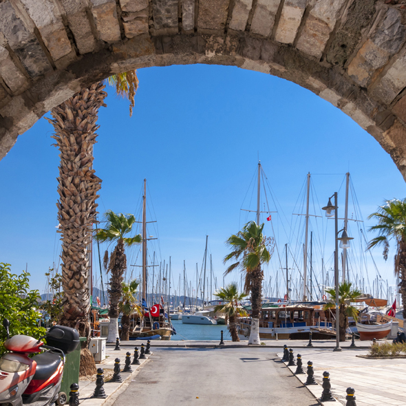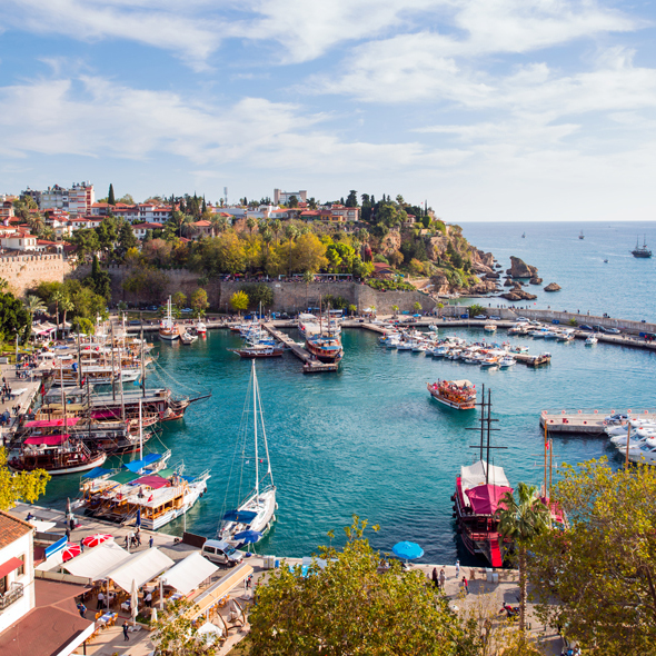 All of the right elements come together to make this sun-drenched Mediterranean town on the Turkish Riviera a major holiday resort. The beautiful crescent bay, dramatic cliffs and jagged mountains contribute to a stunning backdrop. It is an attractive city with shady palm-lined boulevards and a prize-winning marina. In the picturesque old quarter, narrow streets and old wooden houses huddle against the ancient city walls.