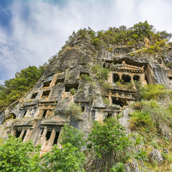 Fethiye is located on the Lycian and Carian border and was called Telmessos in ancient times. The city was very prominent and a centre of prophecy, pledged to Apollon. That the city life was rich and highly cultured during the Hellenistic and Roman periods is evident from the existing monuments. Today the majority of ancient ruins in Telmessos are rock-tombs, Lycian-type sarcophagi, the fortress and the Roman Theatre.