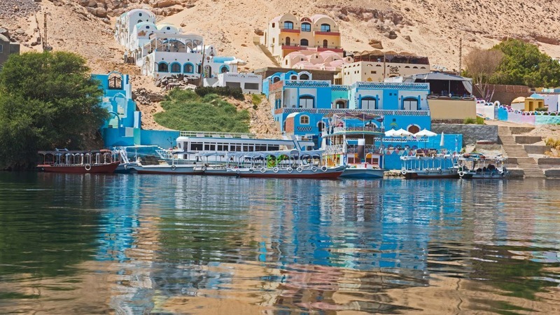 Egypt's southernmost city (population 150,000) and ancient frontier town has the loveliest setting on the Nile. At Aswan the deserts close in on the river, confining its sparkling blue between smooth amber sand and rugged extrusions of granite bedrock. Lateen-sailed feluccas glide past the ancient ruins and gargantuan rocks of Elephantine Island, palms and tropical shrubs softening the islands and embankments till intense blue skies fade into soft-focus dusks.
