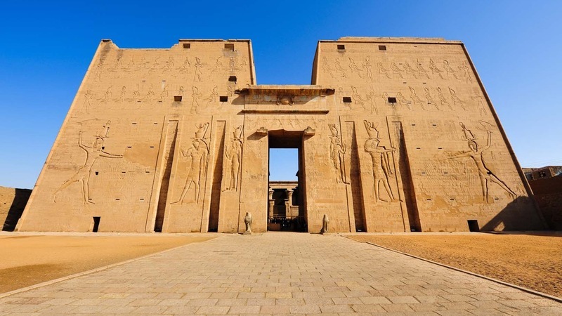 Edfu is located up river from Kom Ombo. It is famous for the Temple of Horus. The Temple of Edfu is very dramatic. It is dedicated to Horus and was built in Greco Roman times. Horus was the god of the sky whose eyes were the sun and the moon. He became equated with the king, and therefore the King was Horus manifest.