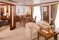 Expertly designed and exquisitely appointed. Ideal for entertaining friends on your luxury cruise or enjoying a quiet dinner “at home”. Available as a one-bedroom suite configuration or as two-bedrooms (as illustrated) by adjoining with a Veranda Suite.One bedroom: 87-101 sq.m. including verandaTwo bedroom: 119-133 sq.m. including verandaPlease note that the 3rd guest will sleep on a comfortable sofa bed in the reception area of the suite.EssentialsDeck(s): 6, 7, 8Section: ForwardCharacteristicsVerandaSeparate dining areaLiving room with sitting areaDouble vanitySeparate showerFull-size bathWalk-in wardrobe with personal safeFurnitureQueen size bedWriting deskVanity tableLuxury bed mattressesMedia & CommunicationUnlimited Premium Wi-Fi2 large flat screen TVs with Interactive Media LibrarySound system with bluetooth connectivityDirect dial telephoneWall mounted USB-C mobile device chargersDual voltage 110/220 outletsOnboard ServicesButler serviceComplimentary laundry, pressing & wet cleaningDaily canapé service, Welcome chocolate, Welcome fruit standDinner for two in La Dame, one evening per voyage,Two hours of worldwide phone use, per voyage segmentChampagne on arrivalAmenitiesEspresso machinePillow menuRefrigerator and bar setup stocked with your preferencesPlush bathrobeLuxury bath amenitiesUmbrellaHair DryerSlippers