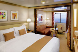Some Terrace Suites accommodate three guests.With a shared veranda, this accommodation provides an easy transition from peace and privacy to the energy and excitement of the onboard social scene. Shared teak veranda and floor-to-ceiling glass doors,Sitting area, Twin beds or queen-sized bed,Marbled bathroom with double vanity, full-sized bath, separate showe,  Walk-in wardrobe with personal safe, Vanity table with hair dryer, Writing desk, Flat screen television with DVD and satellite reception, Direct-dial telephone. 287 SQ. FT.