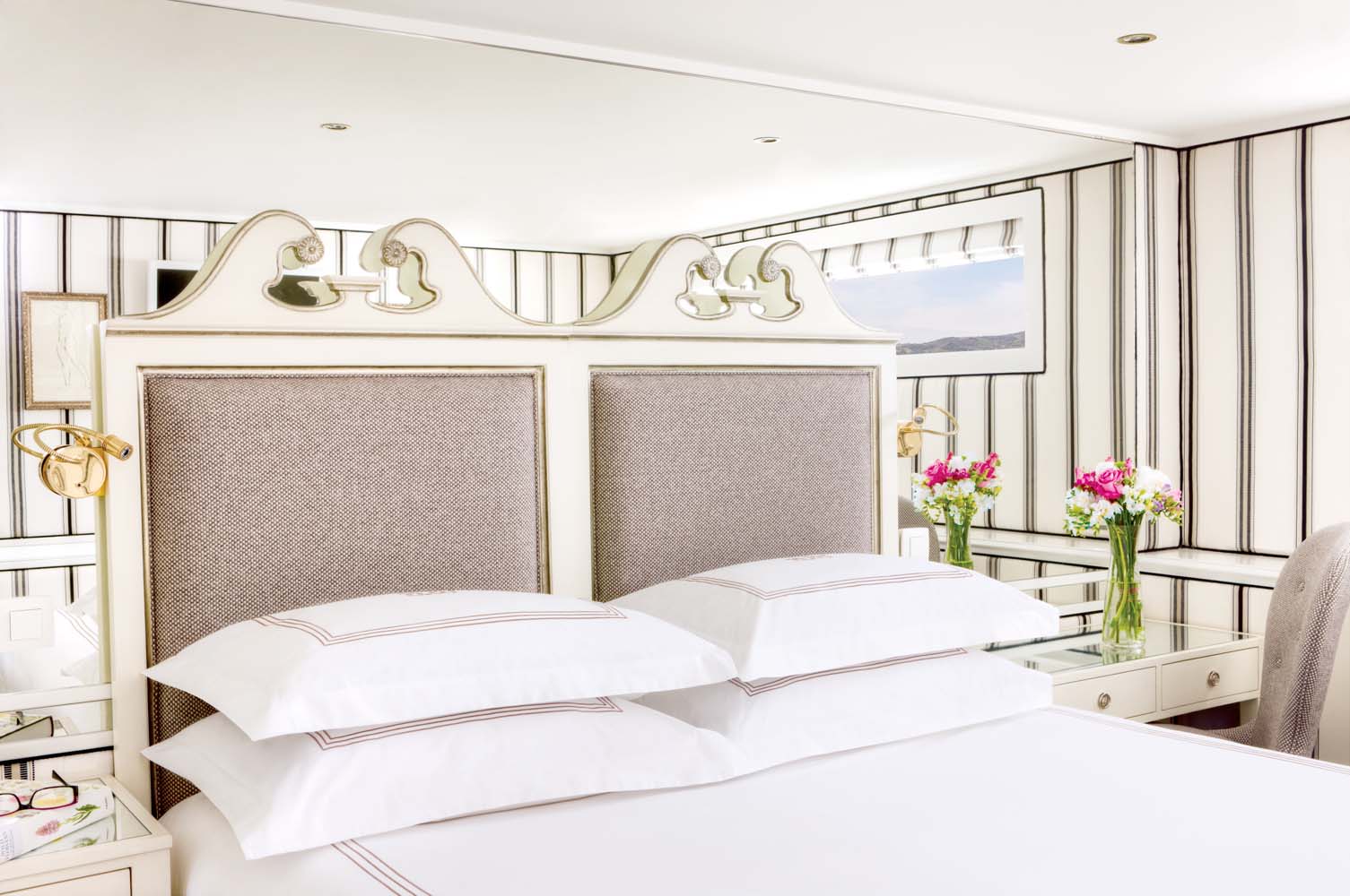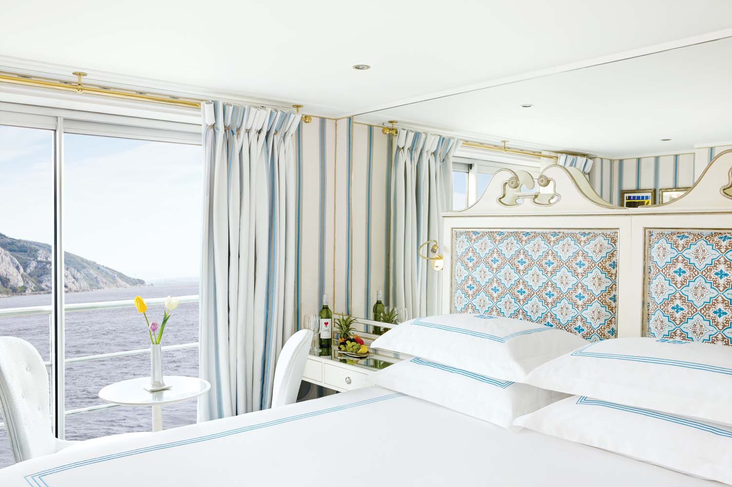 Lavishly appointed riverview stateroom (151 sq ft - 14 sq m)Handcrafted Savoir® Beds of England, built-in closet, hair dryer, safe, individual thermostat, flat-screen TV with infotainment centre and satellite∘, and bottled waterMarble bathroom with Asprey bath and body products, plush towels, waffle bathrobes, and slippers